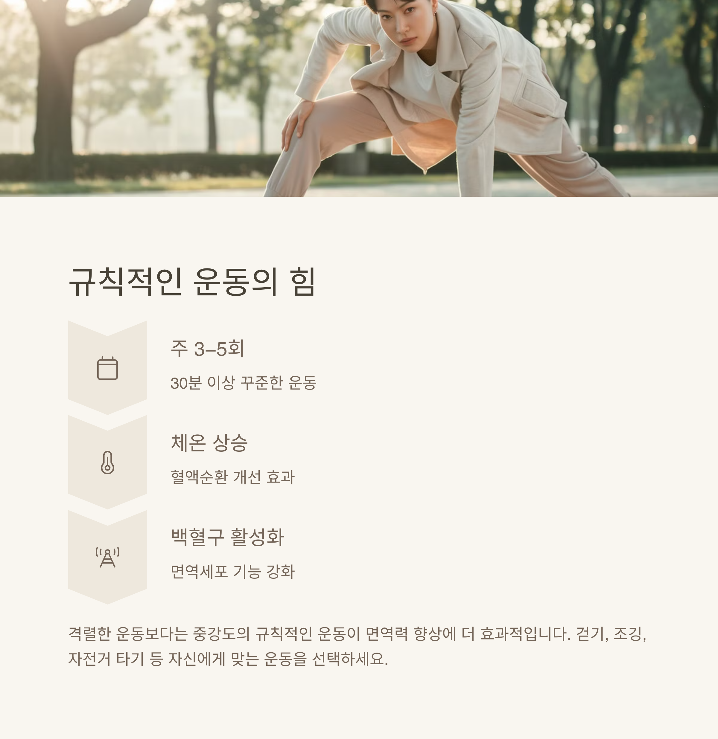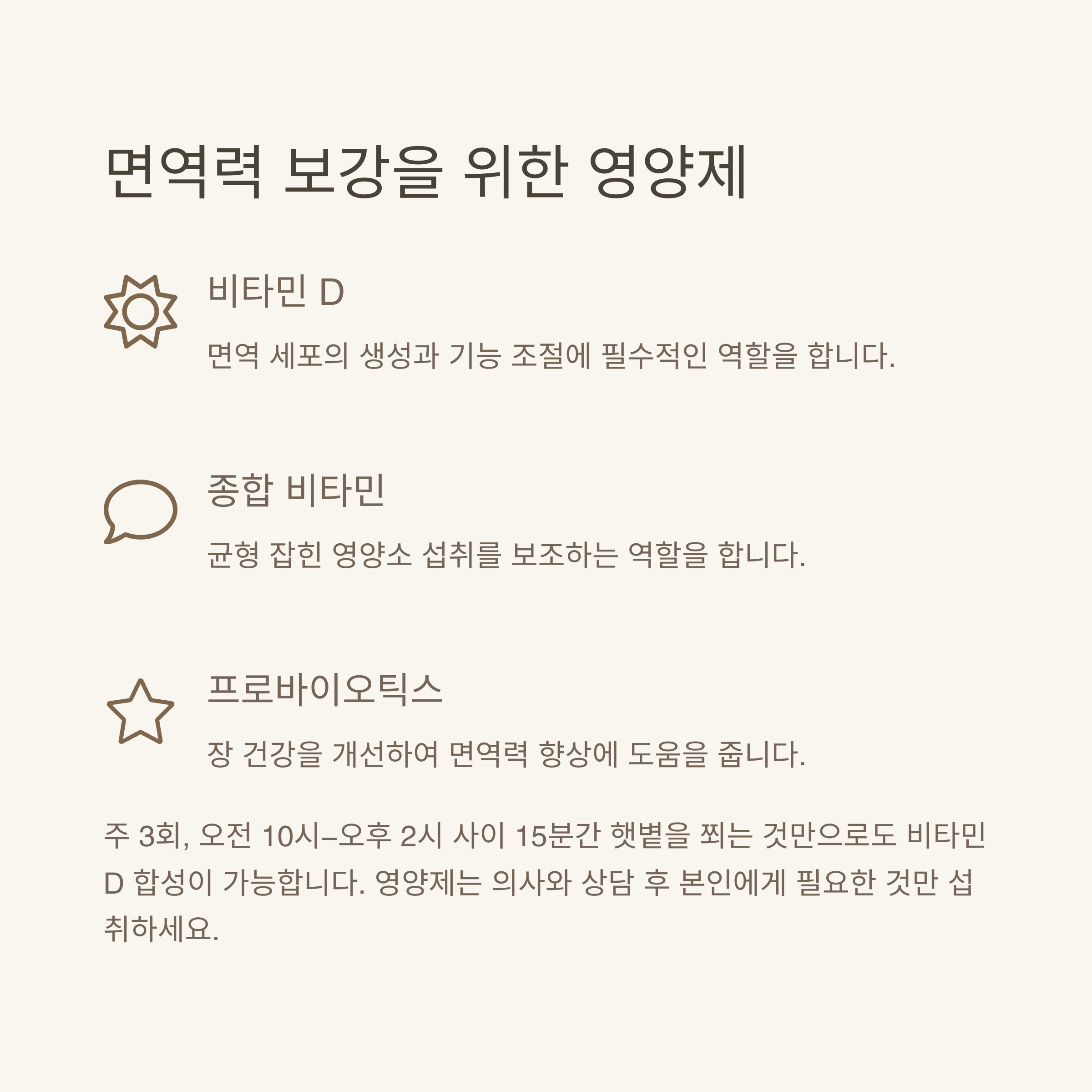 면역력은 단기간에 만들어지는 것이 아닙니다. 꾸준한 습관과 생활관리, 스트레스 완화, 충분한 수면 등 종합적인 관리가 필요해요. 하나씩 실천하다 보면 어느새 계절병에도 끄떡없는 건강한 몸을 갖게 될 거예요.
