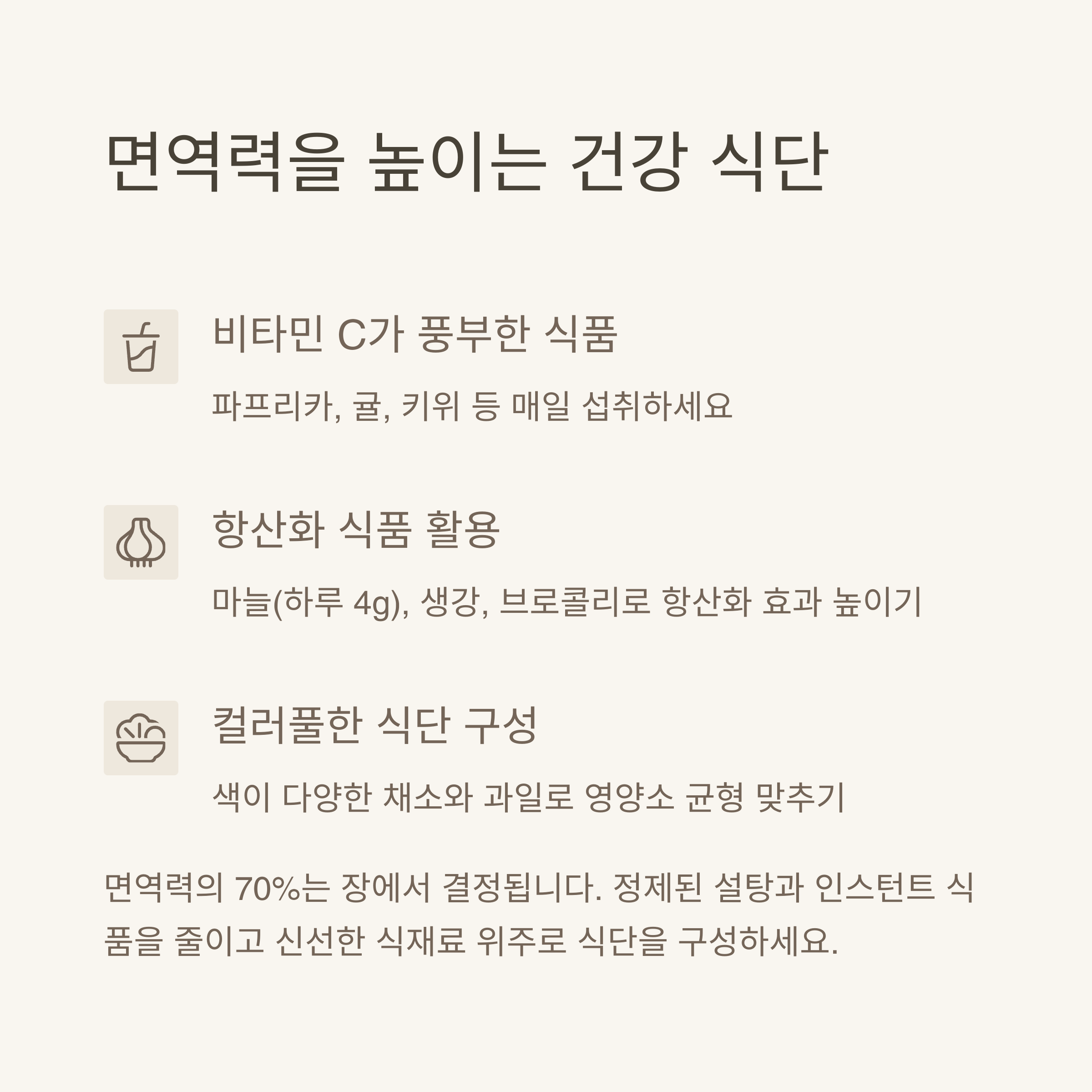 면역력의 기본은 바로 식단에서 시작됩니다. 신선한 채소와 과일은 비타민과 미네랄이 풍부해 우리 몸을 외부 바이러스로부터 지켜주는 중요한 역할을 해요. 특히 비타민 C가 풍부한 귤, 키위, 파프리카, 그리고 항산화 효과가 뛰어난 마늘, 생강, 브로콜리 등은 꼭 챙겨야 할 식재료랍니다.