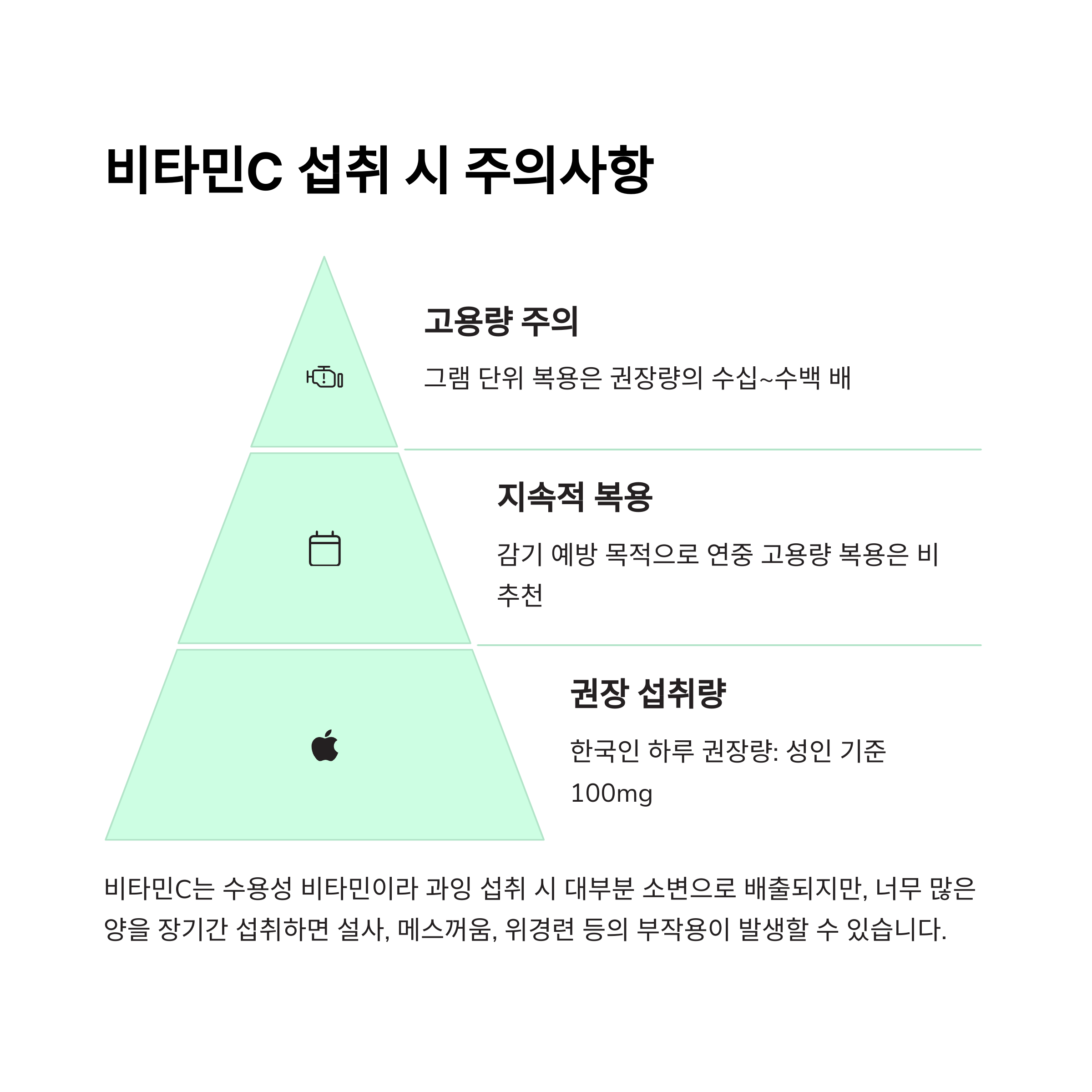 따라서, 비타민C를 보충제로 섭취할 때는 적정량을 준수하는 것이 중요하며, 필요 이상의 과다 섭취는 피하는 것이 바람직합니다.