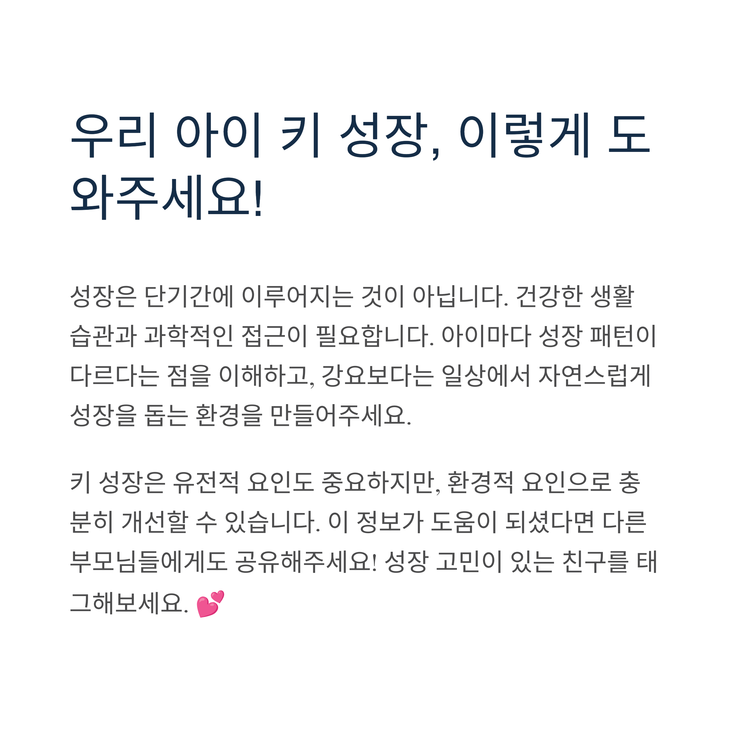 성장호르몬은 단순한 키 성장 호르몬이 아닙니다. 우리 몸의 균형과 에너지를 조절하고, 아이의 신체적 성장뿐 아니라 심리적인 자신감에도 큰 영향을 미치죠. 오늘 소개해드린 수면 시간, 운동 습관, 식단 조절은 바로 지금부터 실천할 수 있는 것들입니다. 작은 습관 하나가 아이의 미래 키를 결정할 수도 있습니다. 꾸준한 관심과 실천으로 건강하고 튼튼한 성장을 이끌어보세요. 이 글이 여러분과 자녀에게 도움이 되었다면, 다른 부모님들과도 꼭 나눠주세요. 함께 성장하는 사회, 함께 키우는 건강, 우리 모두의 바람이니까요.