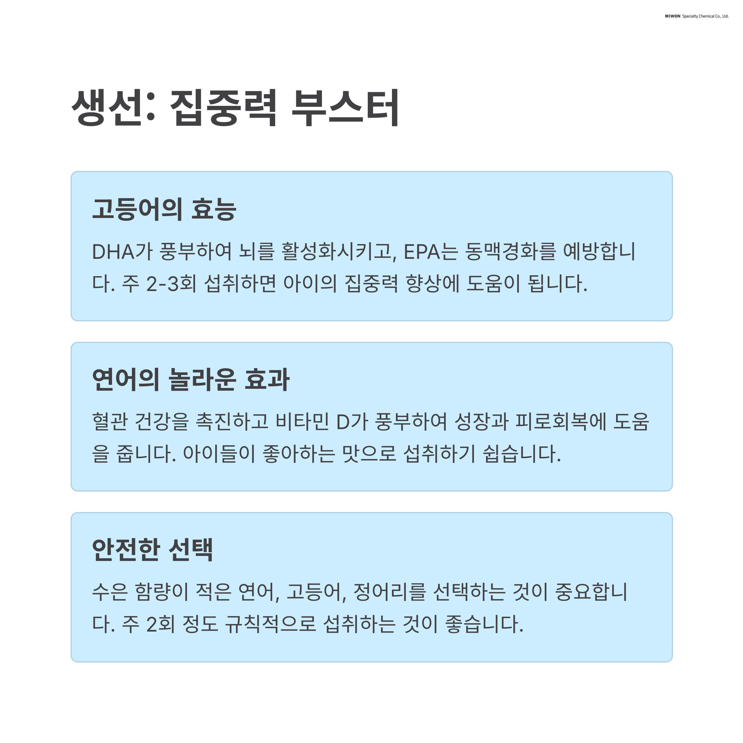 오메가-3 지방산, 철분, 아연, 비타민 B군이 집중력 향상에 도움을 줍니다.