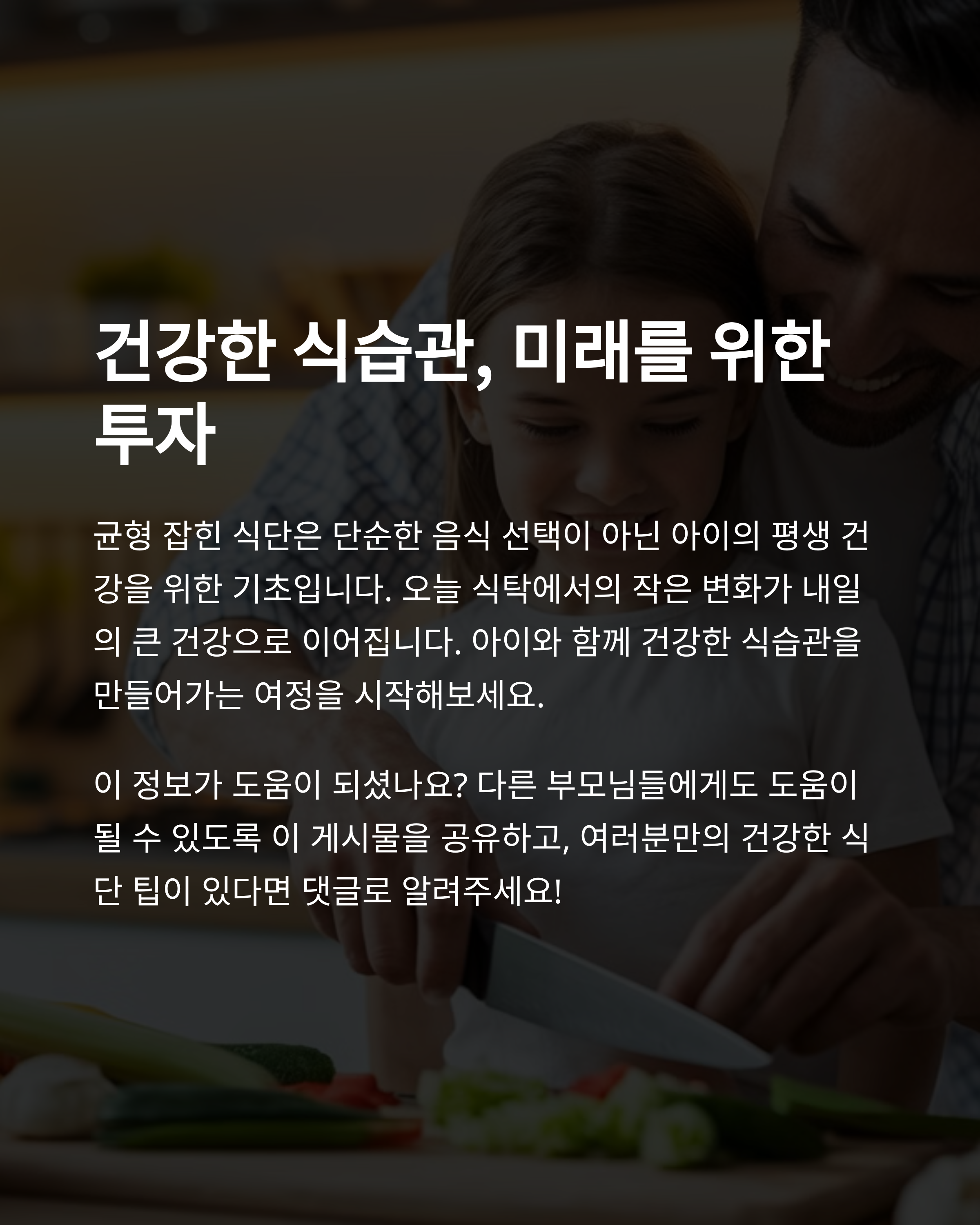 어린이의 건강을 위한 균형 잡힌 식단은 단순히 좋은 습관을 만드는 것 이상의 중요한 역할을 합니다. 올바른 식습관을 형성함으로써 아이들은 성장에 필요한 영양소를 충분히 섭취하고, 장기적으로 건강한 생활을 영위할 수 있습니다. 가족 모두가 함께 노력하여 건강한 식사 문화를 만들어가는 것이 중요합니다.