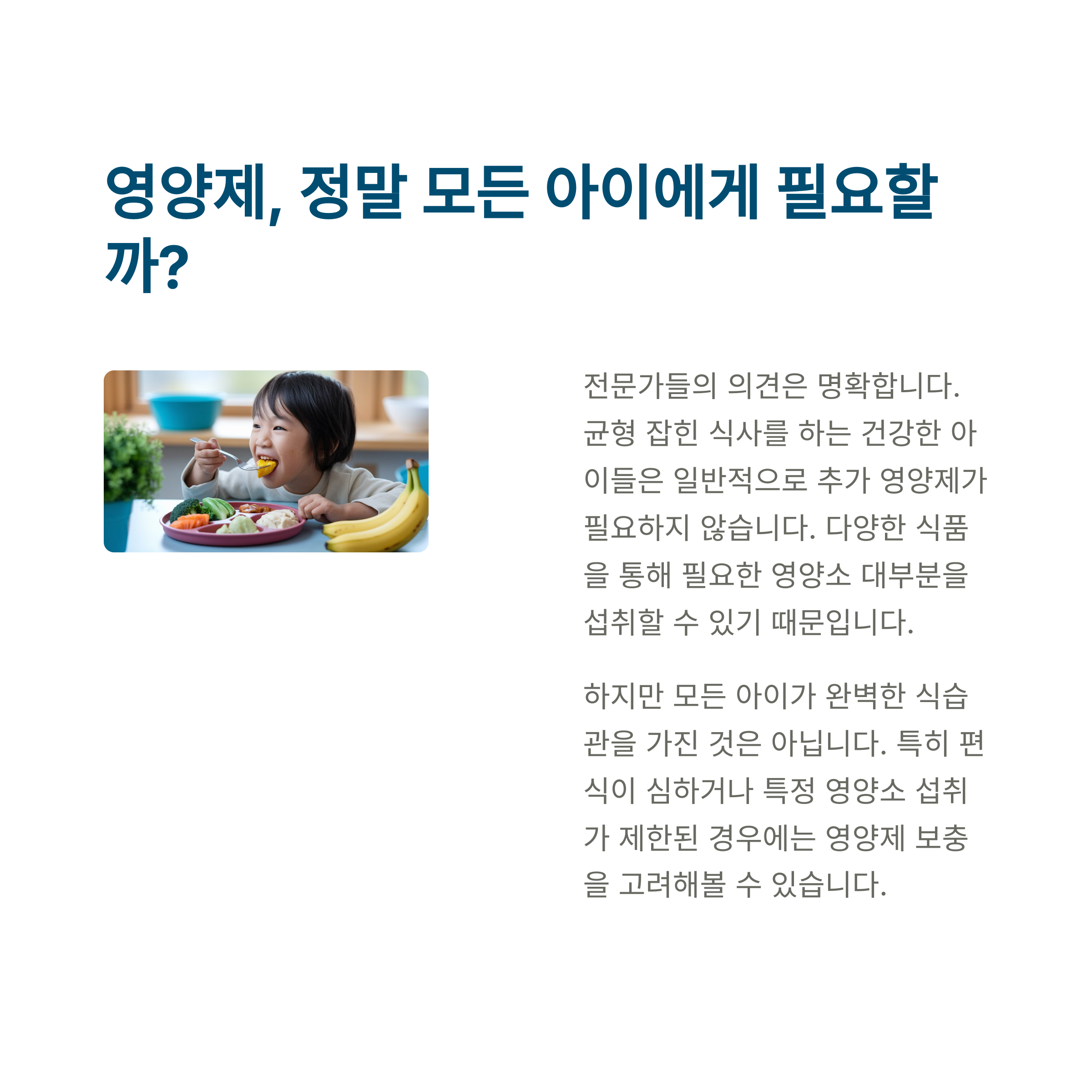 우리 아이에게 꼭 필요한 영양제일까, 아니면 균형 잡힌 식사가 더 중요할까? 과학적인 근거와 전문가 의견을 살펴봅니다.